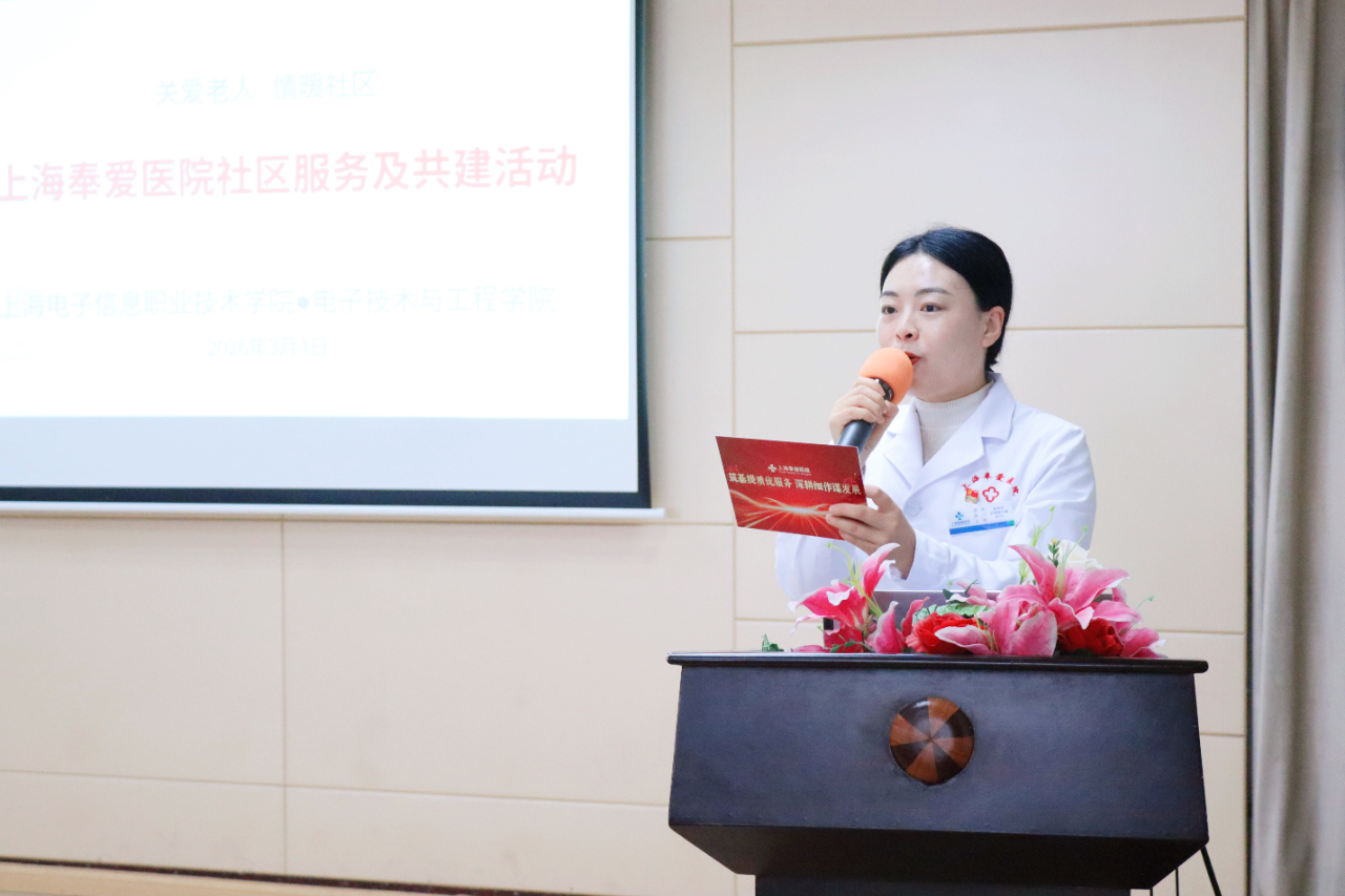 活动伊始,主持人张玮玮隆重介绍了参与此次活动的校方领导:上海电子信息职业技术学院电子技术与工程学院团委书记潘书记、上海电子信息职业技术学院电子技术与工程学院指导老师聂博老师。并邀请上海奉爱医院陶培丽院长为活动发表暖心致辞,向在场的长辈们致以诚挚的问候与美好祝福,话语间满是关怀与暖意,为本次活动拉开温馨序幕。